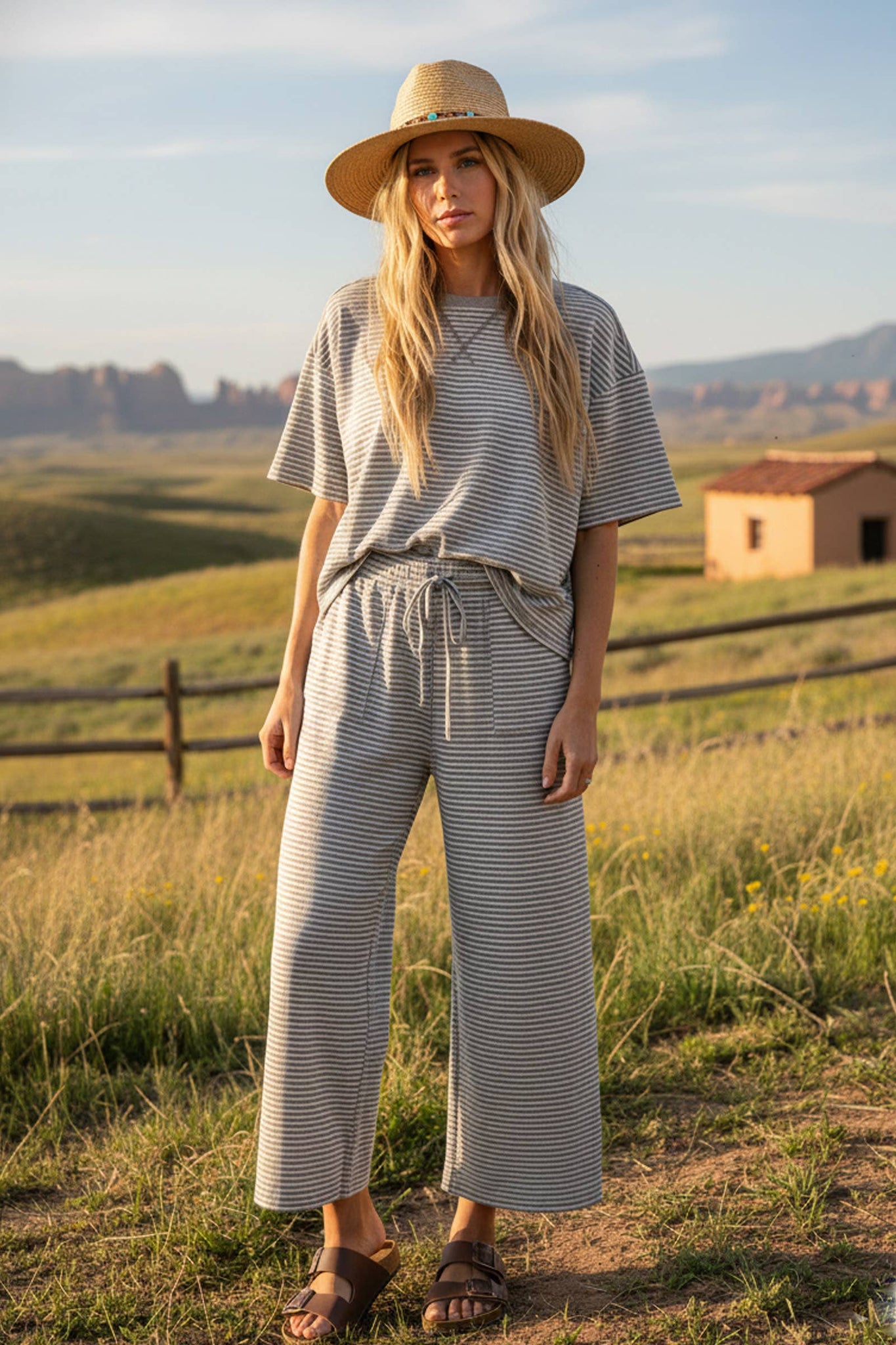 Get cozy with an effortless everyday set you’ll live in. This heather grey ribbed knit set features a relaxed short-sleeve top paired with matching wide-leg pants for an easy, pulled-together look.