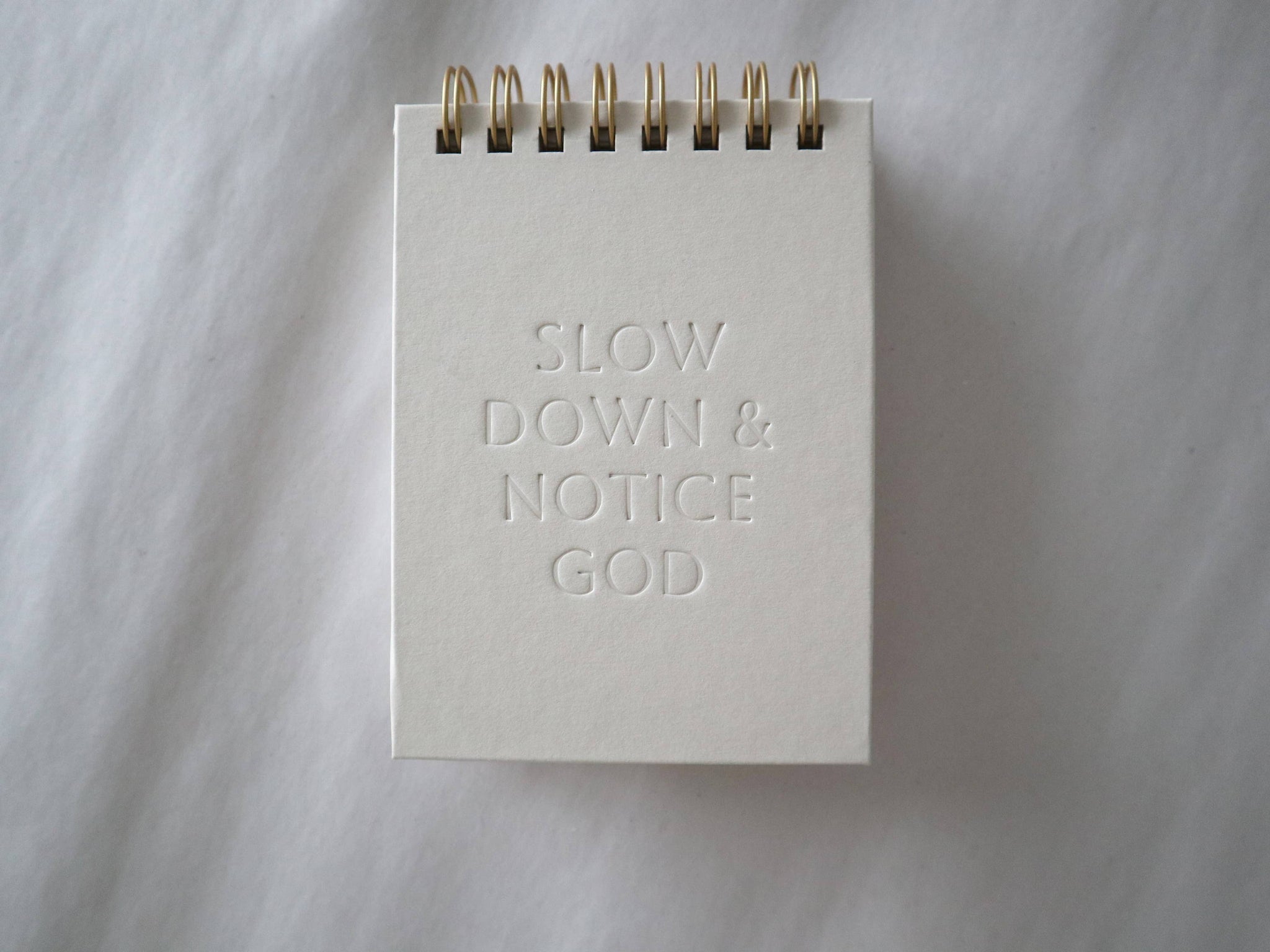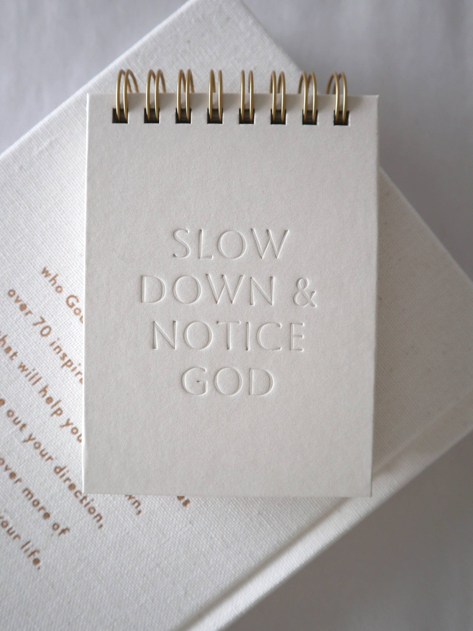 Jot down your notes with this mini notebook featuring the reminder “Slow Down & Notice God” embossed on the front. Designed for everyday moments, this 3" × 4" jotter includes 65 blank pages for notes, prayers, and to-do lists, all wrapped in a sturdy mat board cover with spiral binding. Small enough to slip into your purse or pocket, it’s a simple, meaningful companion to help you pause and stay present throughout the day.
